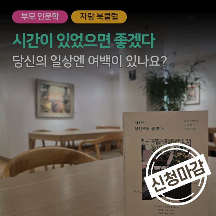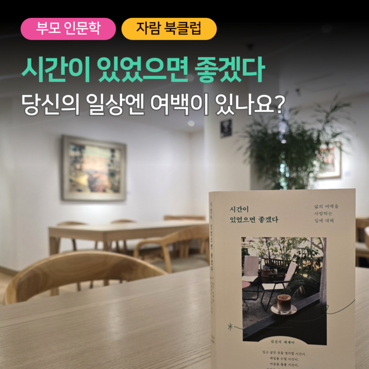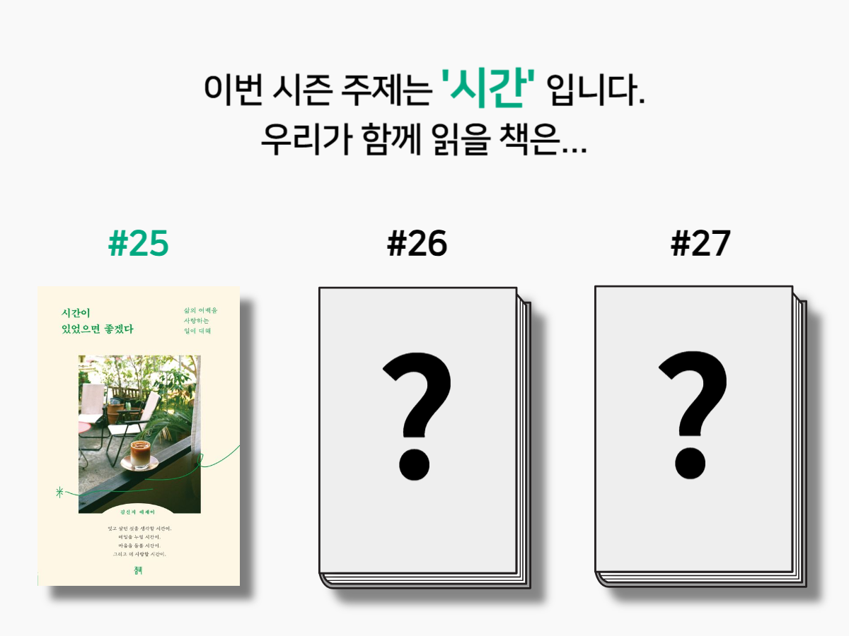이번 북클럽에서는 책 <시간이 있었으면 좋겠다>를 함께 읽으며, 우리가 살아가는 '시간' 에 대해 깊이 생각해보는 시간을 마련해보아요.